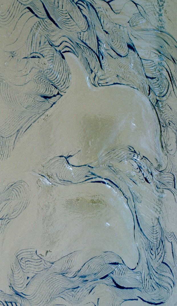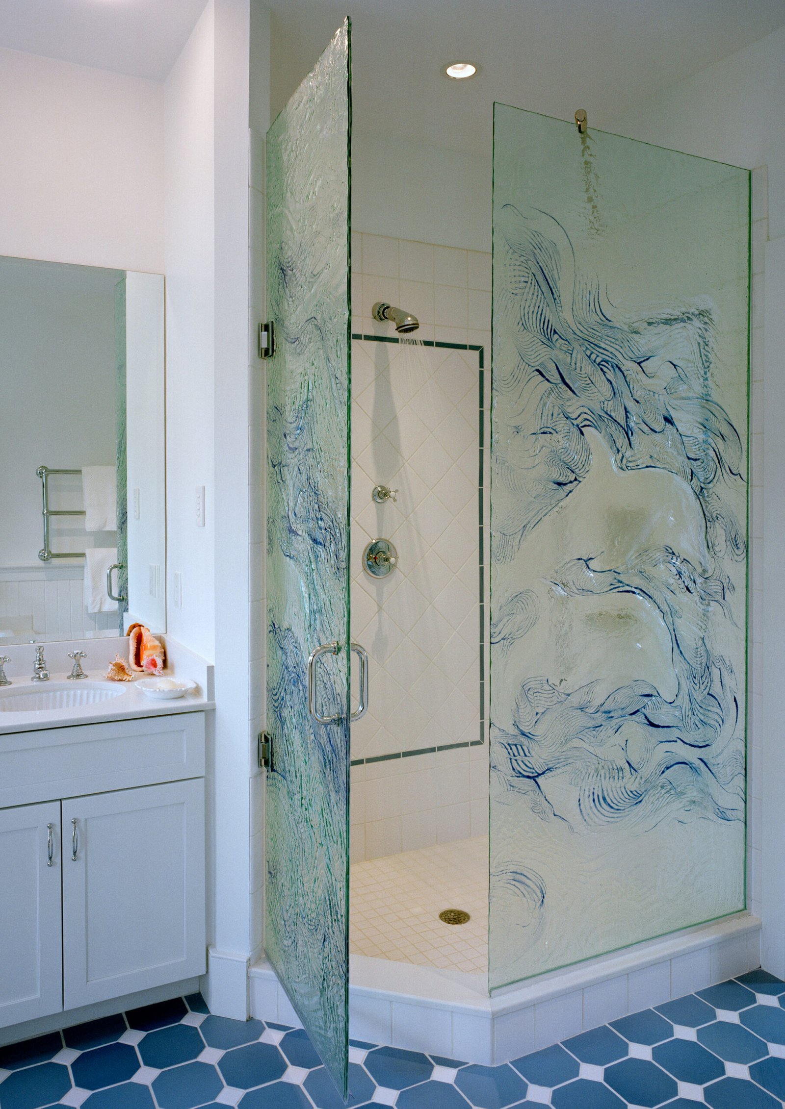 A custom cast glass shower enclosure was designed and fabricated for the bathroom of the Chase Residence. The large-scale glass panels feature an organic, hand-sculpted texture with flowing imagery rendered in blue glass frit, fused directly into the surface of the cast glass. The sweeping, wave-like patterns create a dynamic and artistic focal point within the space, while the translucent quality of the glass allows light to pass through, enhancing the depth and movement of the design. The enclosure includes a hinged frameless door with polished chrome hardware, precision-drilled fittings, and seamless edge finishing — achieving a harmonious integration with the white tile surround and the blue hexagonal floor tile of the bathroom.