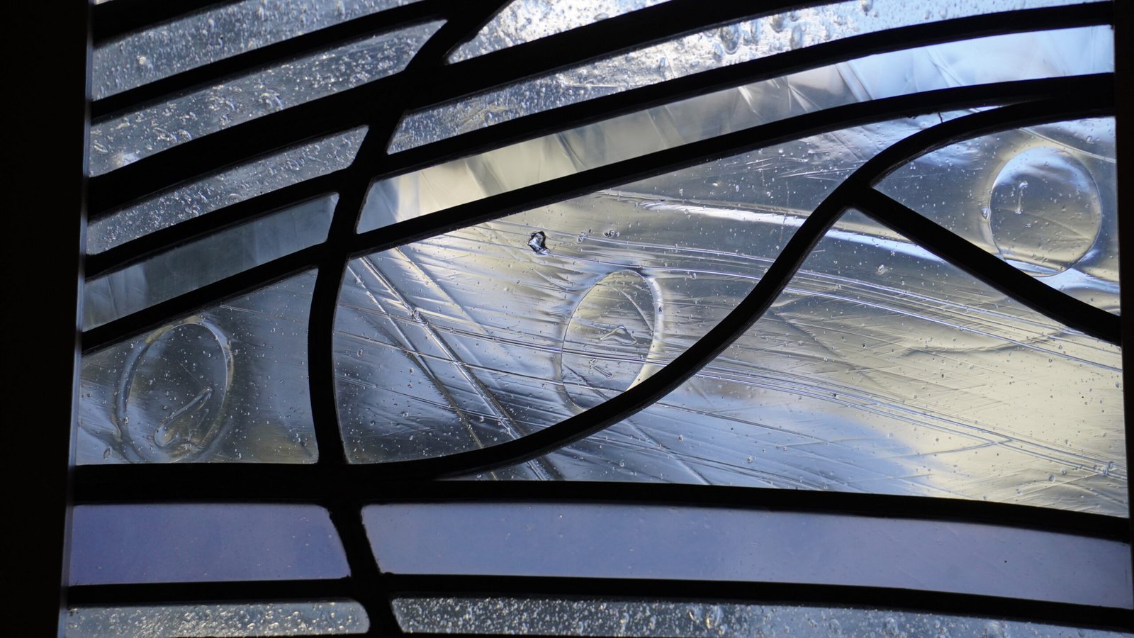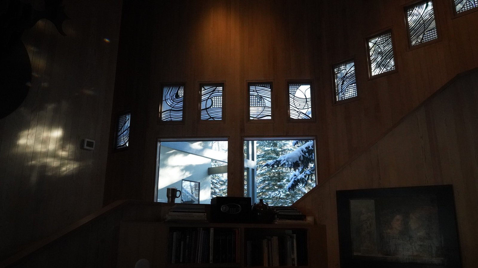The leaded glass windows of the Hines Residence are located on a wall that wraps around a huge cedar tree that fills a courtyard. The prismatic and clear antique glass, which compose the windows, bring the color, form and texture of the tree into the window plane.