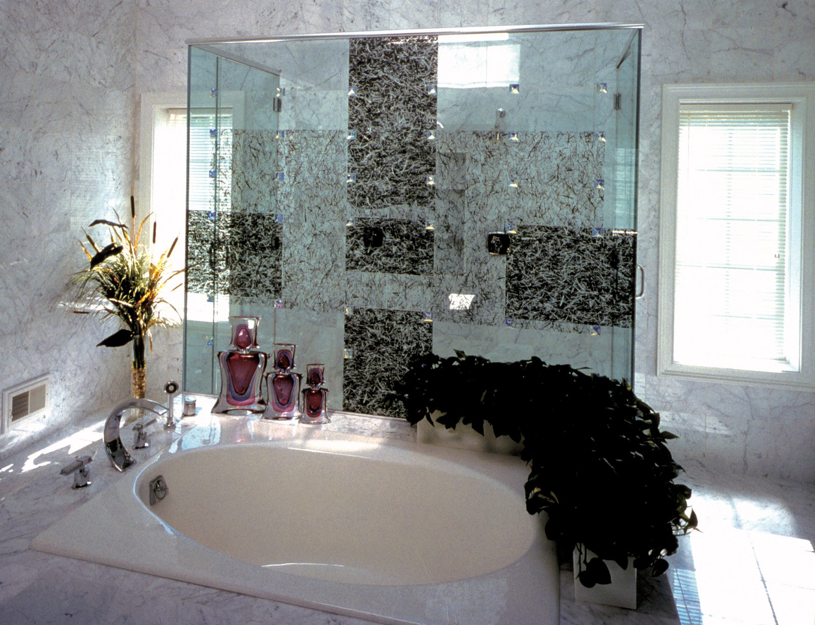 The shower enclosure is relatively open visually though there is a graphic pattern of stone veining on the front panel of glass as a reference to the marble used in the bathroom. This pattern is a positive and negative imagery silk-screened with glass paint and then fired permanently during the tempering process.