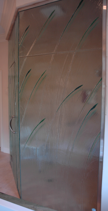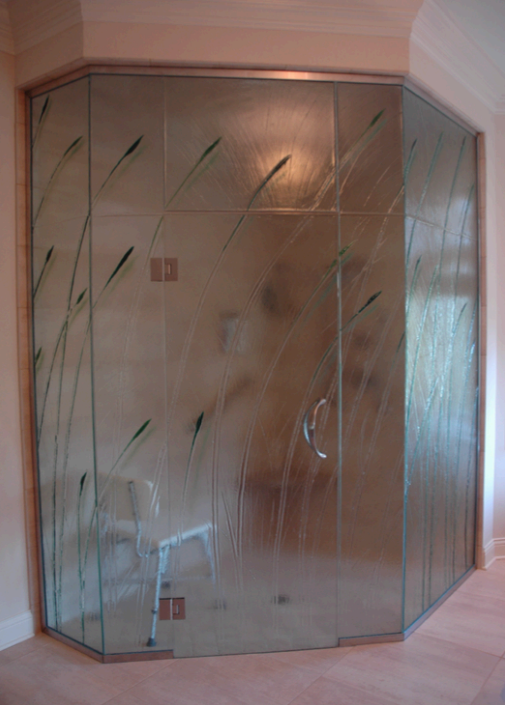 In planning for the glass shower enclosure in the master bedroom, Muhammed had expressed an interest in something of natural form. From this I developed a pattern of broad gesture strokes like the Foxtail Buffalo Grass of South Africa, which was translated into glass with textural gestures and fused green glass frit. The background of the glass was softly textured to provide some privacy but also a sense of openness.