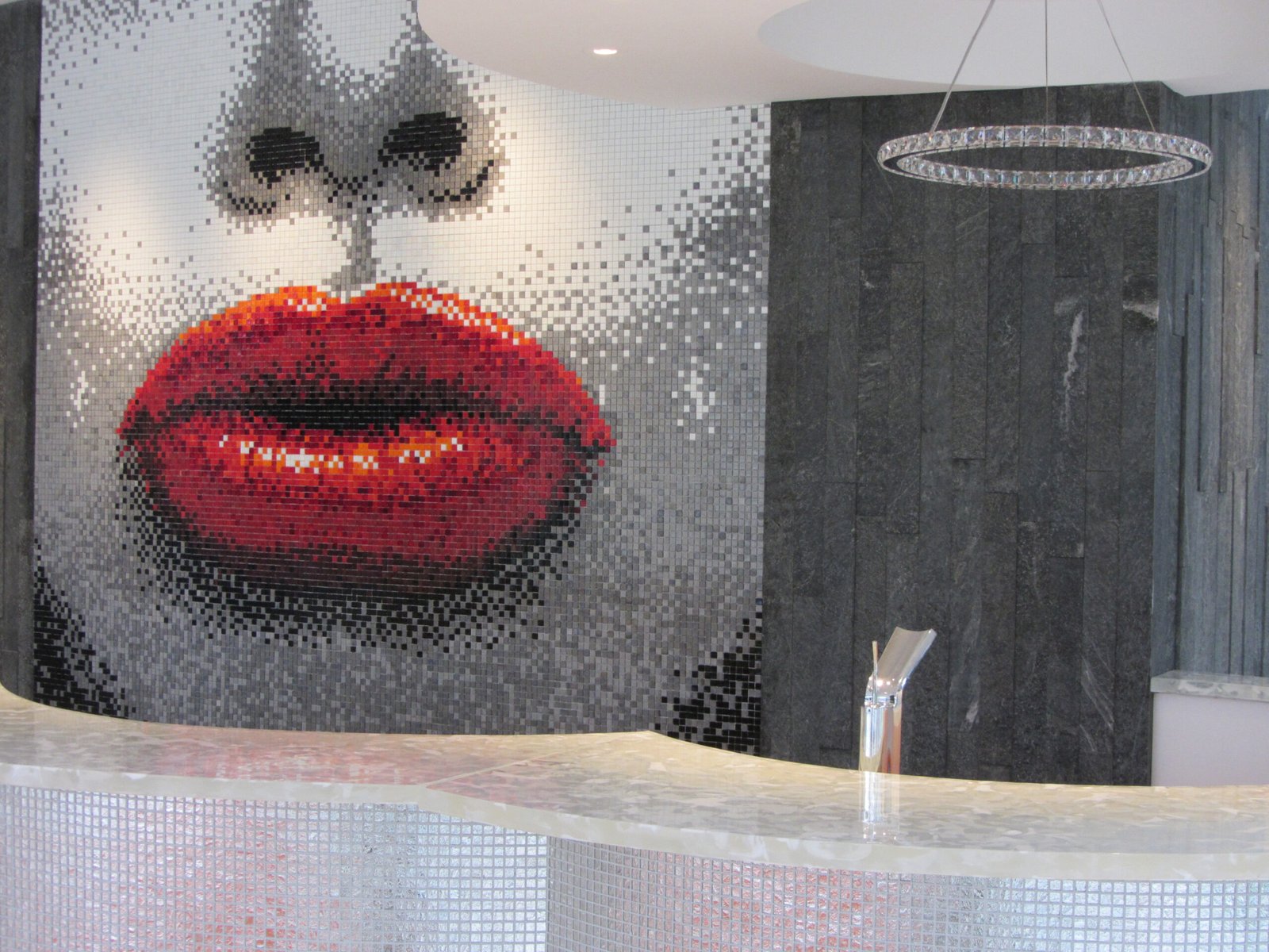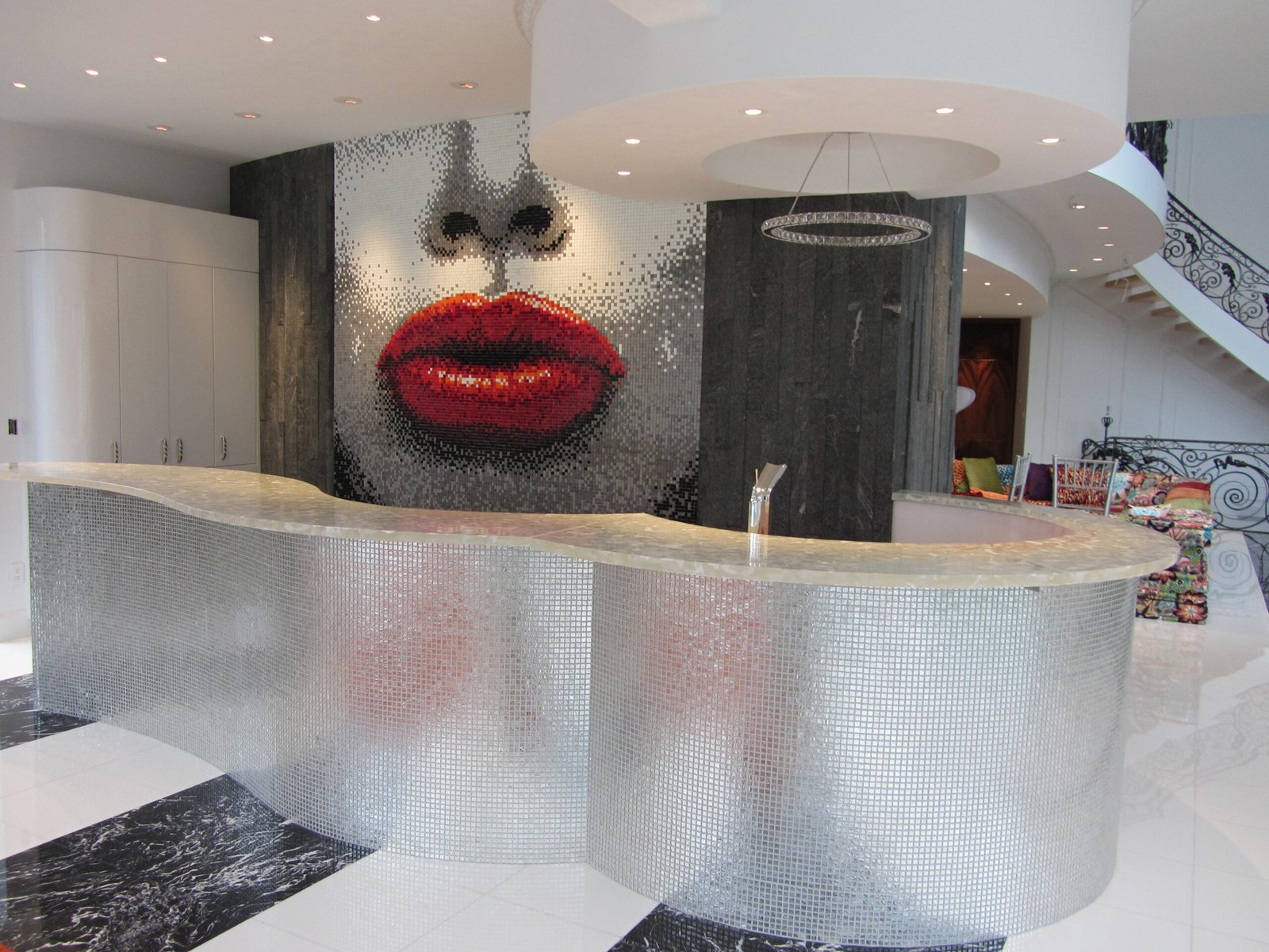 In the lower level of the Payvalias home is the entertainment room, the central element of which is the dramatic bar area with the exotic cast glass with fused white glass shards, which gives the overall appearance of white that contrasts with the mosaic imagery of bright red lips on the rear wall.