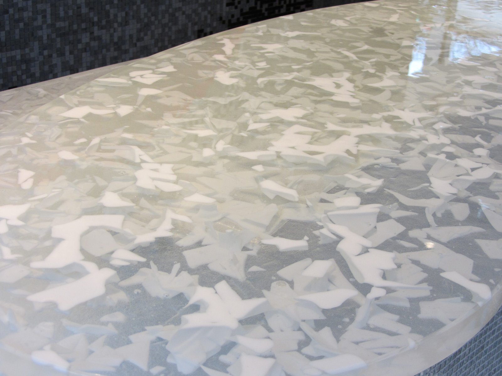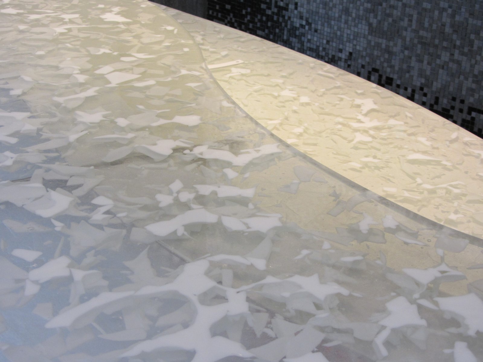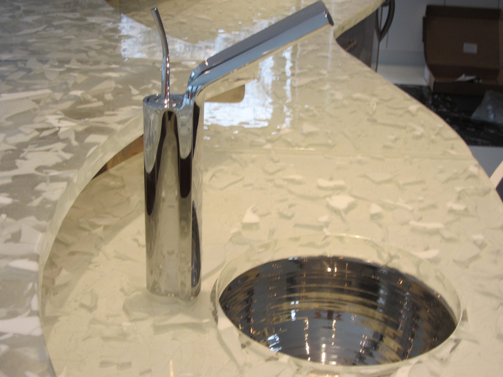 The 1.5” cast glass has polished edges with cut out area for the undercounted mounted polished stainless steel sink.