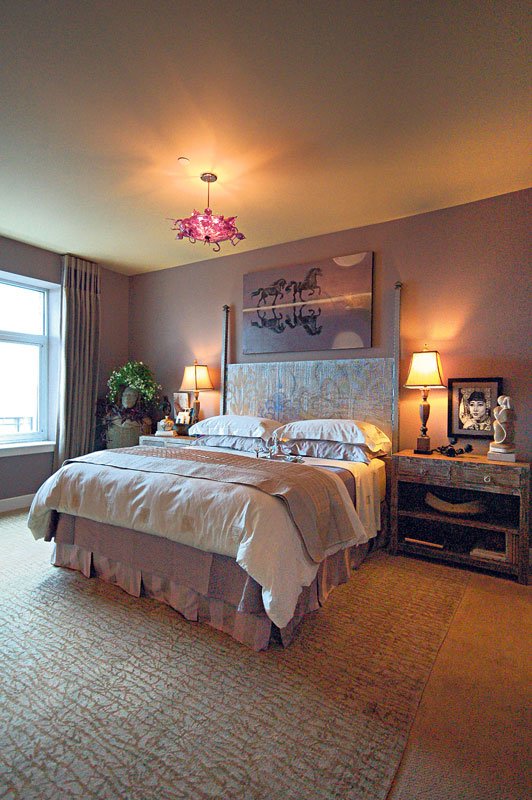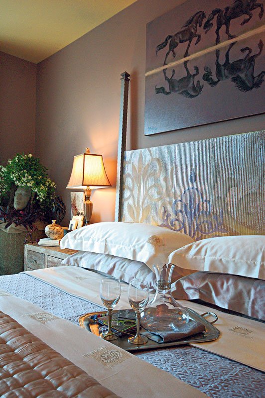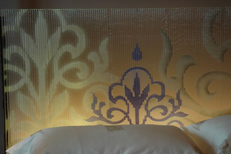 We collaborated with the local ASID chapter in the design of an exhibition of contemporary elements with a traditional flair. We proposed a glass head board for a bed that incorporated lighting which served as ambient room lighting. The glass is cast and tempered with fused glass frit collaged pattern with a vertical ribbed texture.