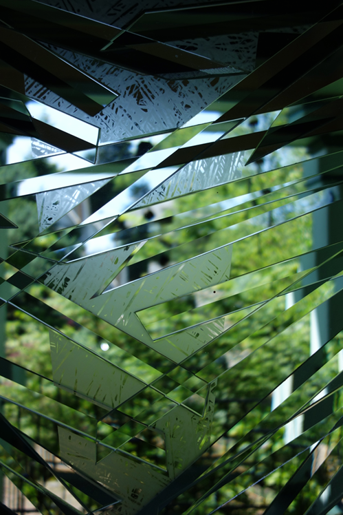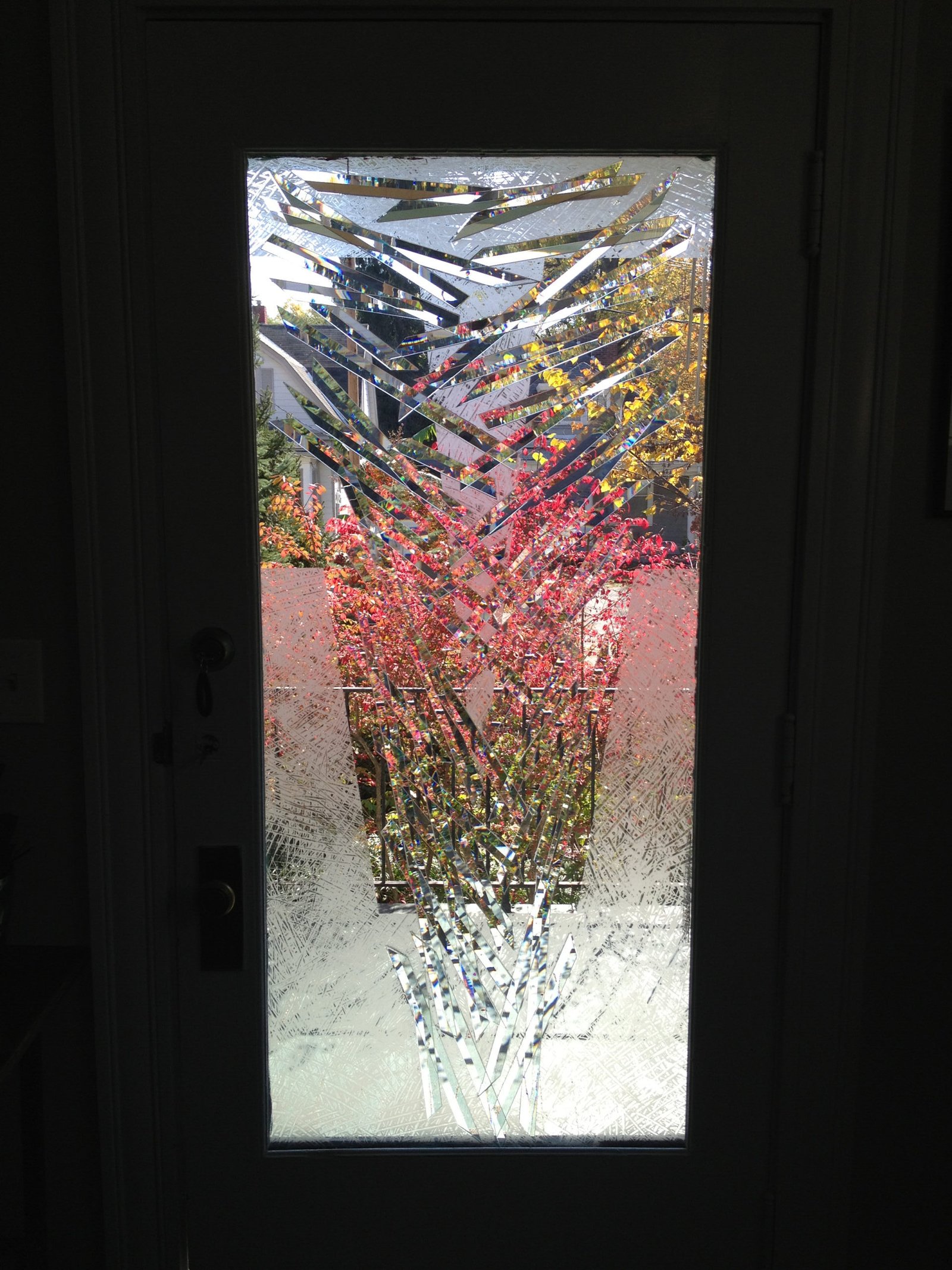 The client requested that I develop a concept for the front door of their home to represent the collapse of the Twin Towers because the original glass was damaged on that day. The composition is developed with laminated prismatic glass shards and etched areas in irregular cross hatching pattern. The prismatic glass visually fractures the imagery beyond, providing a modest sense of privacy. The etched areas serve as a background form to the prismatic glass pattern.