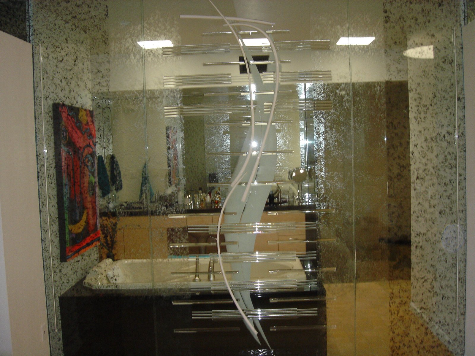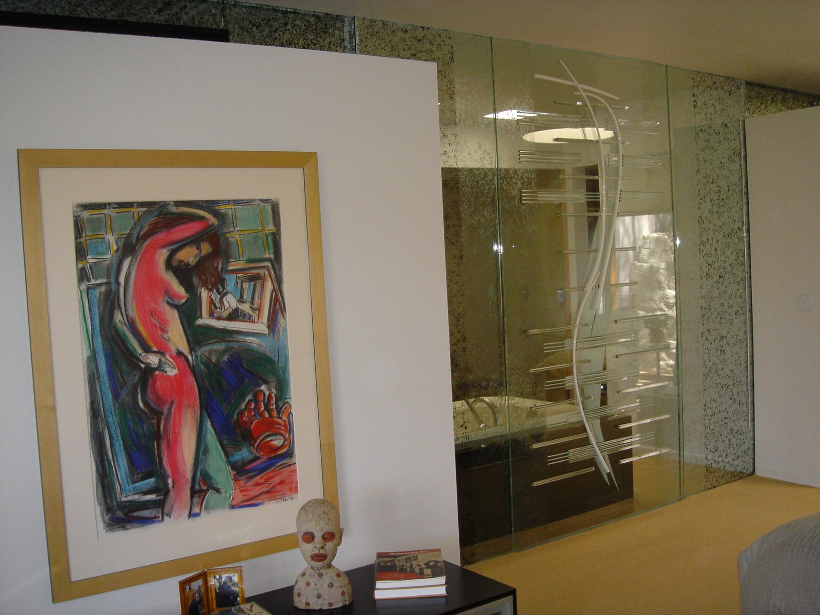 The Ratoff ’s had requested that I create a glass wall between their bedroom and the bathroom that would allow a fair amount of visibility between the spaces. The work consists of horizontal clear glass rods and curved white rods laminated to the front surface of the glass. An etched pattern was applied to the glass with a hydrofluoric acid.