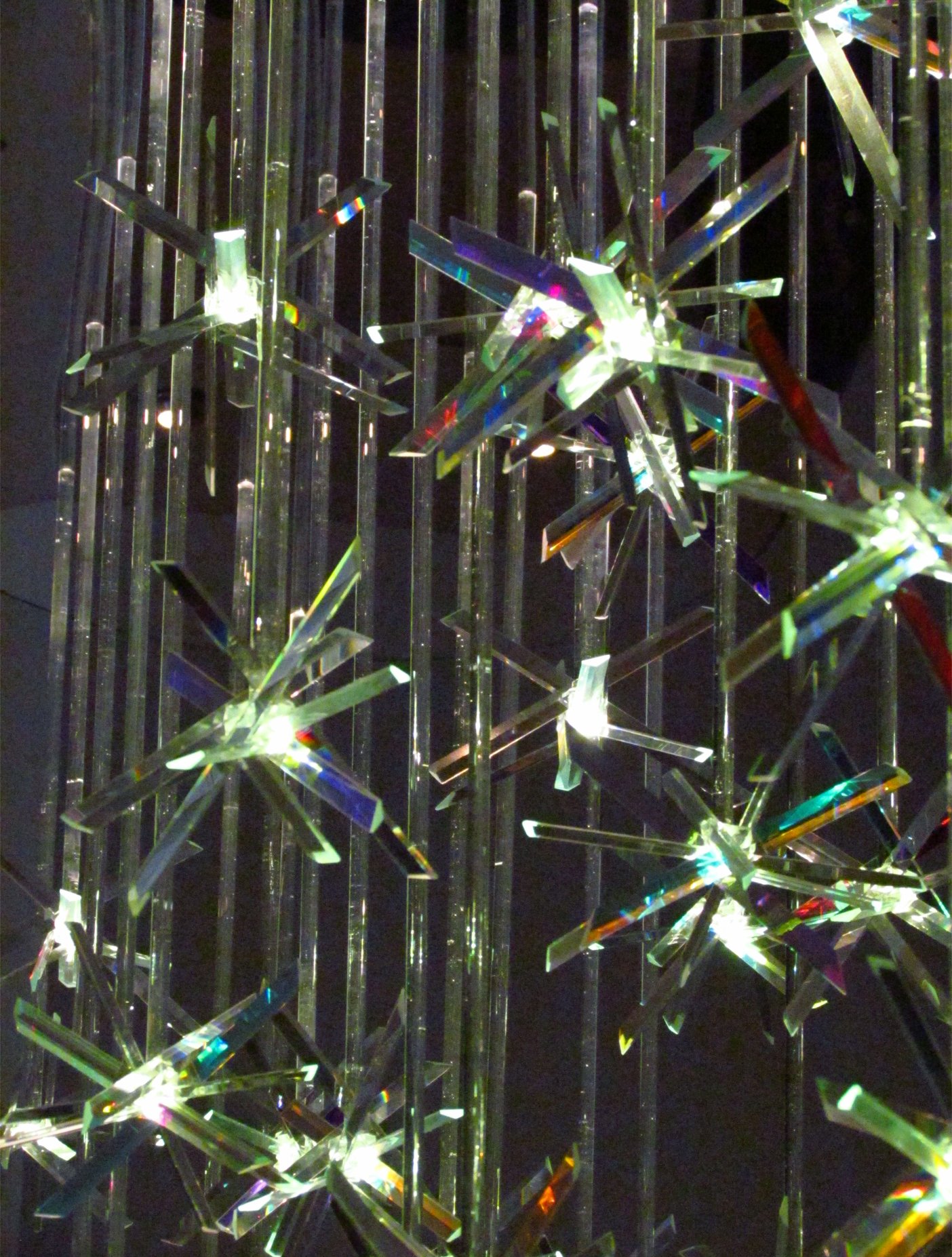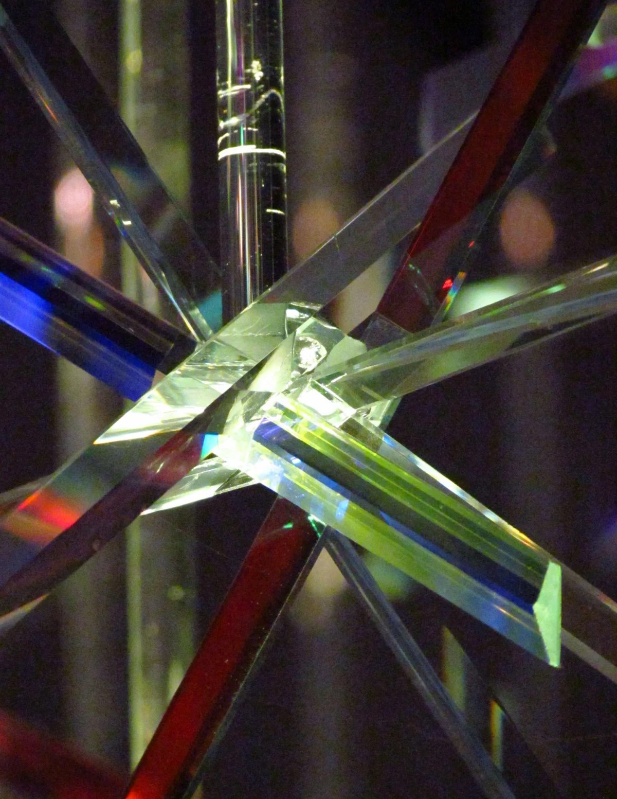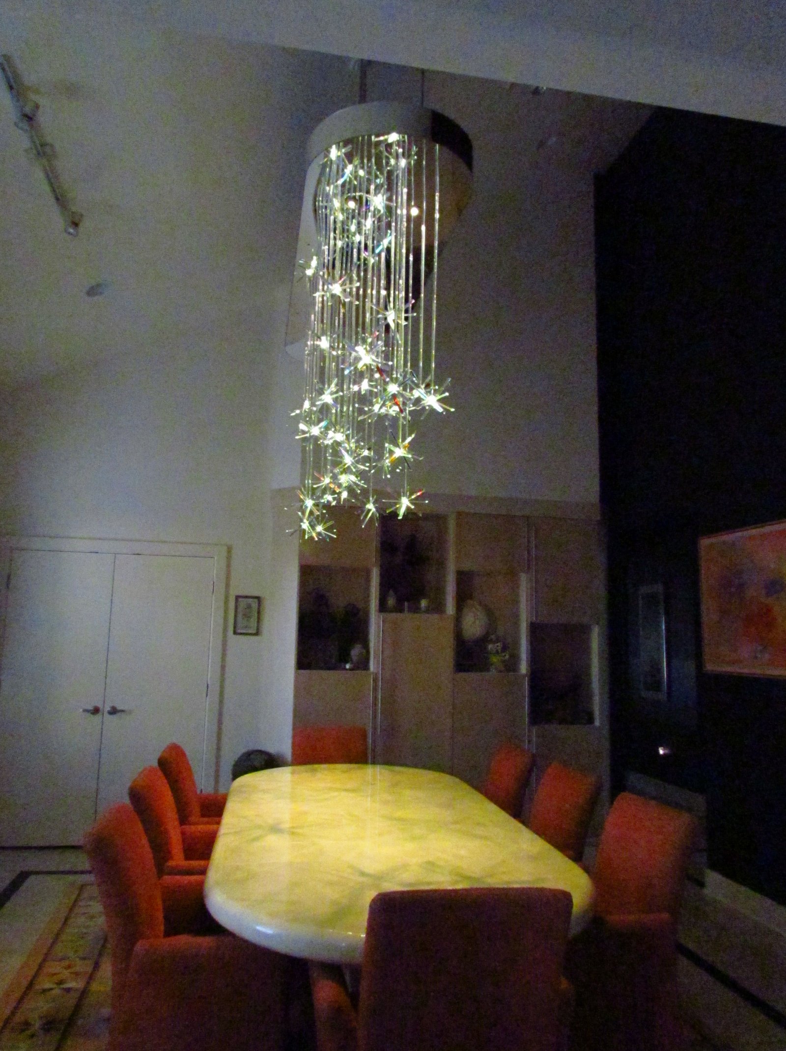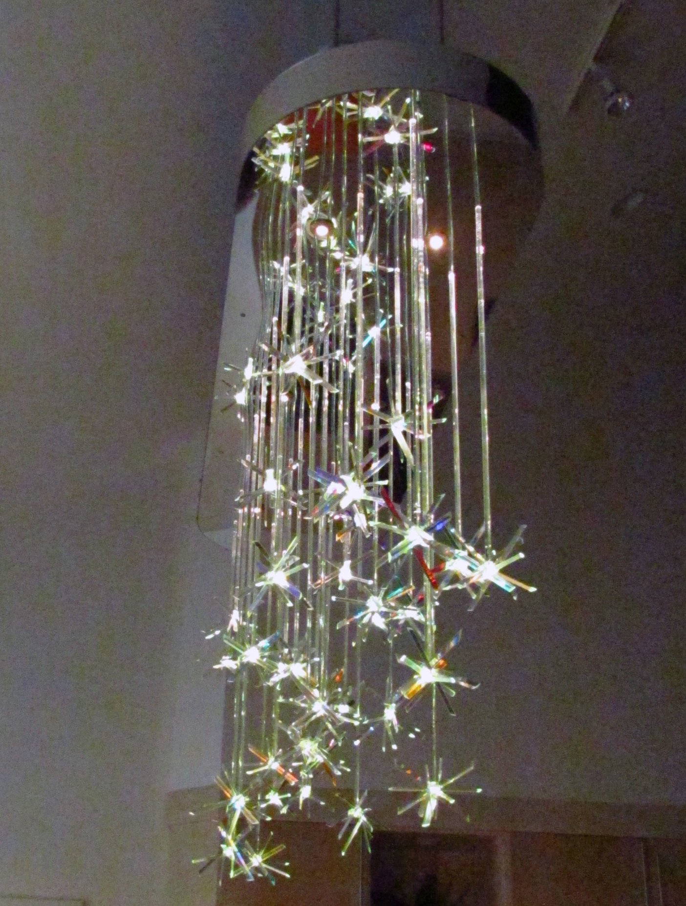 The ceiling mounted light fixture is composed of an oval shaped base secured to the ceiling in which high intensity LED lights are positioned to illuminate glass rods that transmit the lights to the prismatic ‘star’ forms which are laminated to the ends of the glass rods of varying length. The ‘stars’ glow from the transmitted light from the glass rods which is also reflected from the underside of the ceiling mounted base.